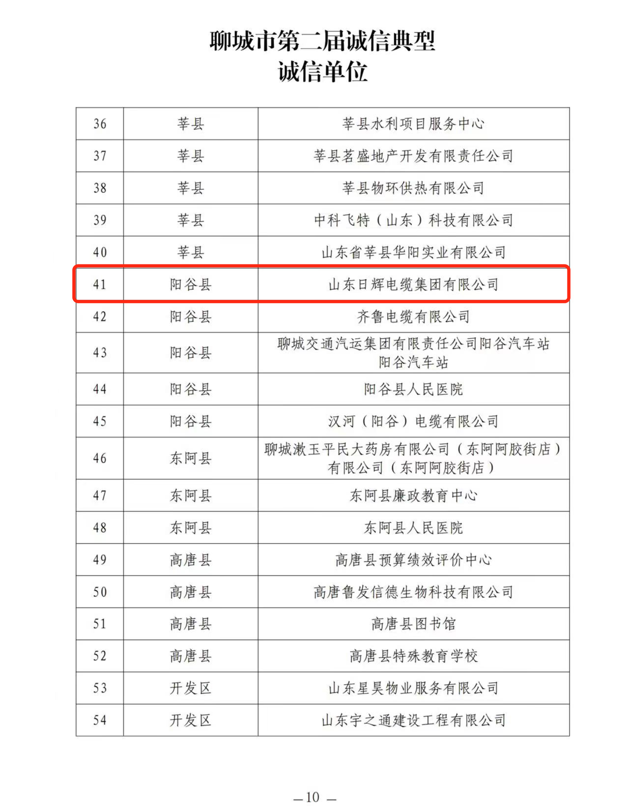 近日,由市發展改革委員會同市委宣傳部、市文明辦、市工信局、市市場監管局、中國人民銀行聊城市分行共同主辦的聊城市第二屆誠信典型選樹活動結果公布,山東日輝電纜集團有限公司榮獲“誠信單位”稱號,彰顯了公司在誠信經營、社會責任等方面的卓越表現。
