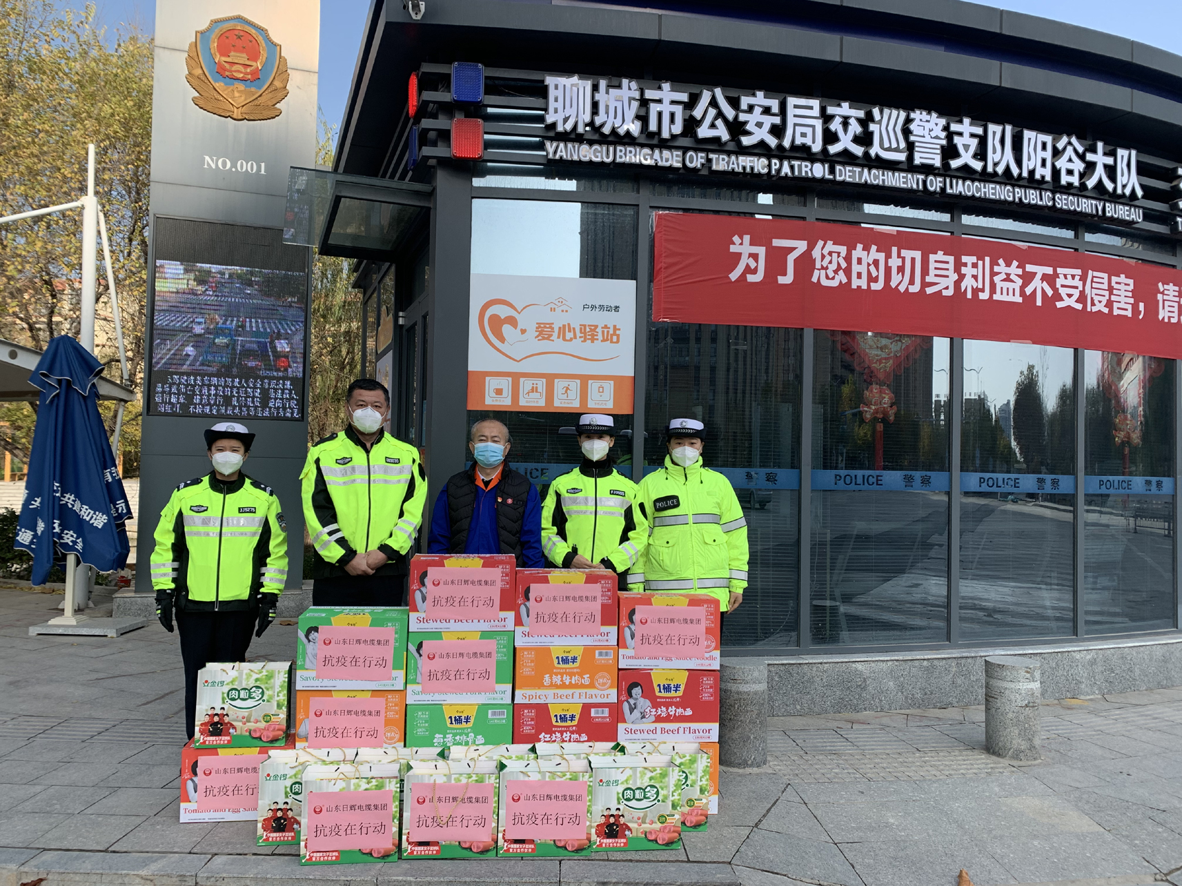 疫情當前人人有責,攜手共進抗疫情。11月26日上午,山東日輝電纜集團有限公司董事長薛士國、綜合部經理王敬等人來到陽谷城區,為參與抗疫工作、堅守在防疫一線的交通警察送去溫暖,公司為他們送去了20多箱桶裝方便面、火腿腸等生活用品。