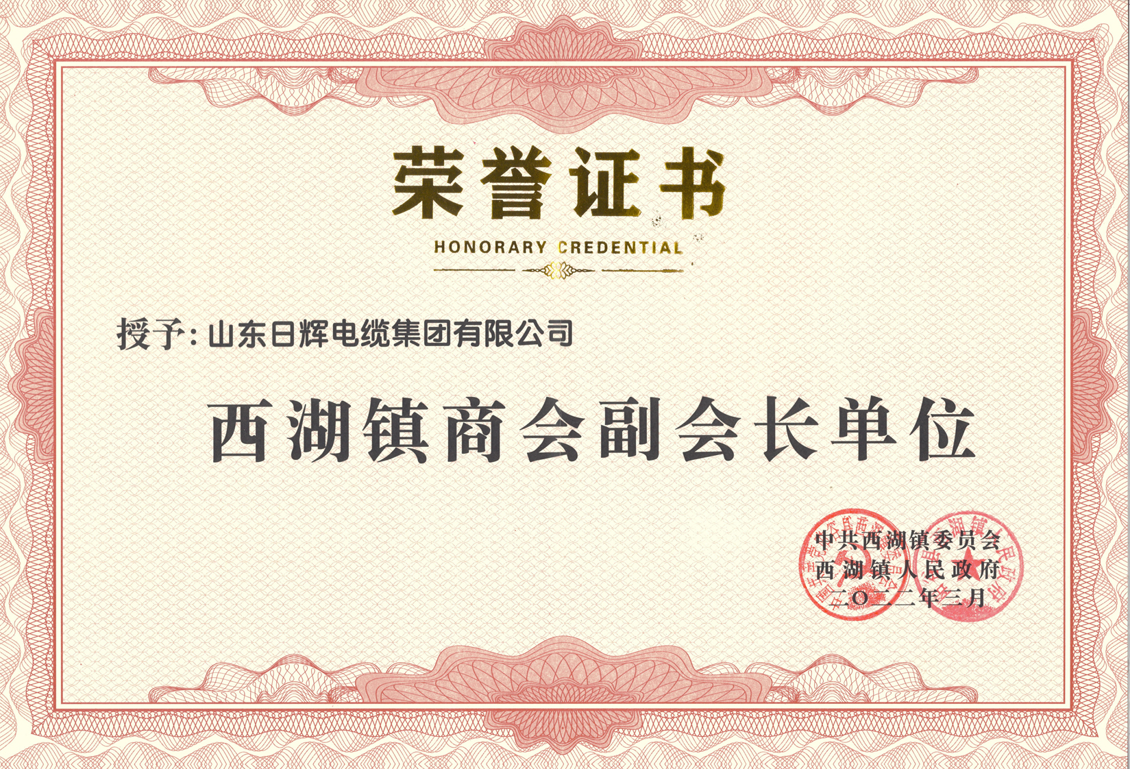 山東日輝電纜集團有限公司成為西湖鎮商會副會長單位
