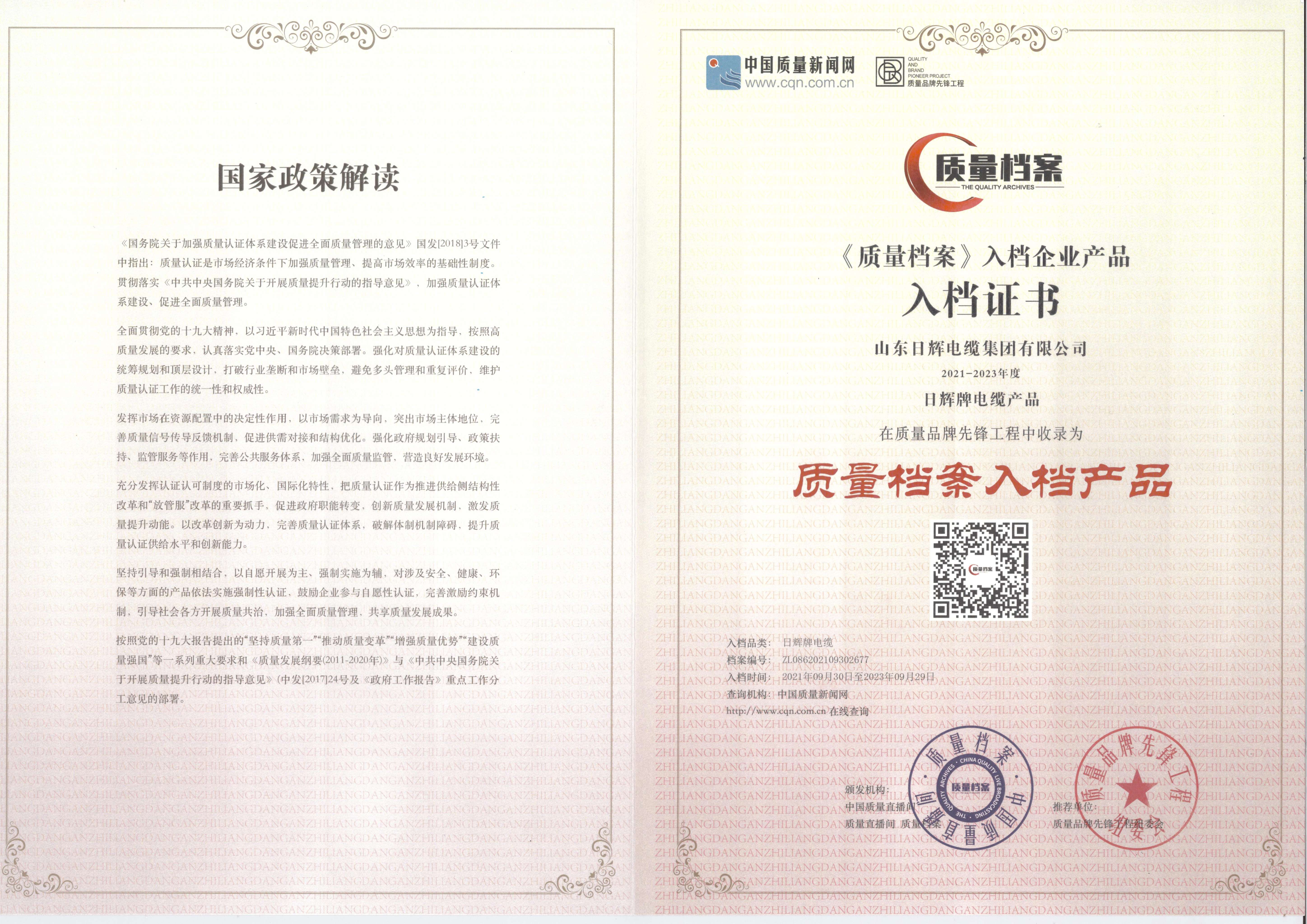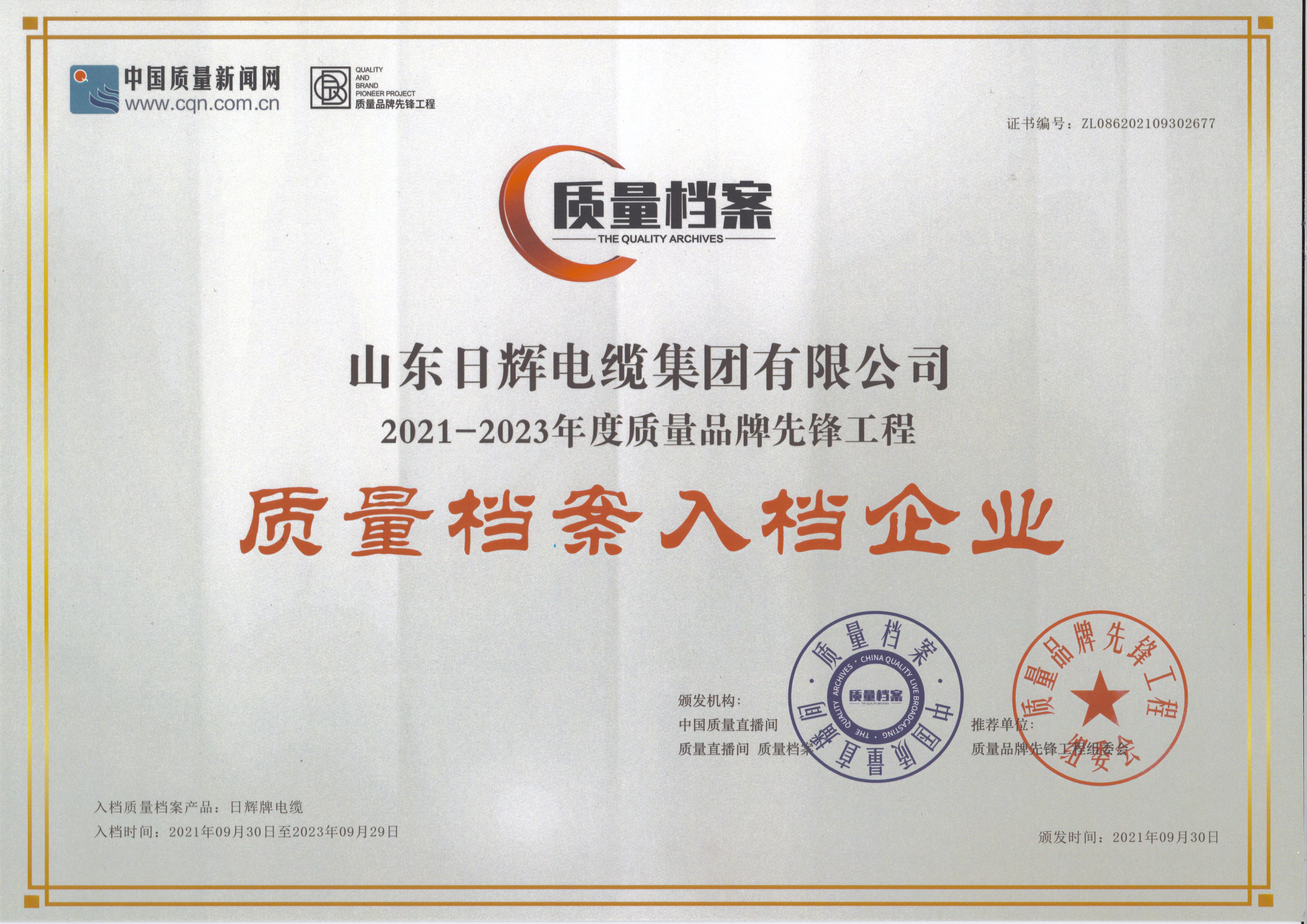 熱烈祝賀山東日輝電纜集團有限公司在 “2021-2023年度質量品牌先鋒工程”中成為質量檔案入檔企業。
