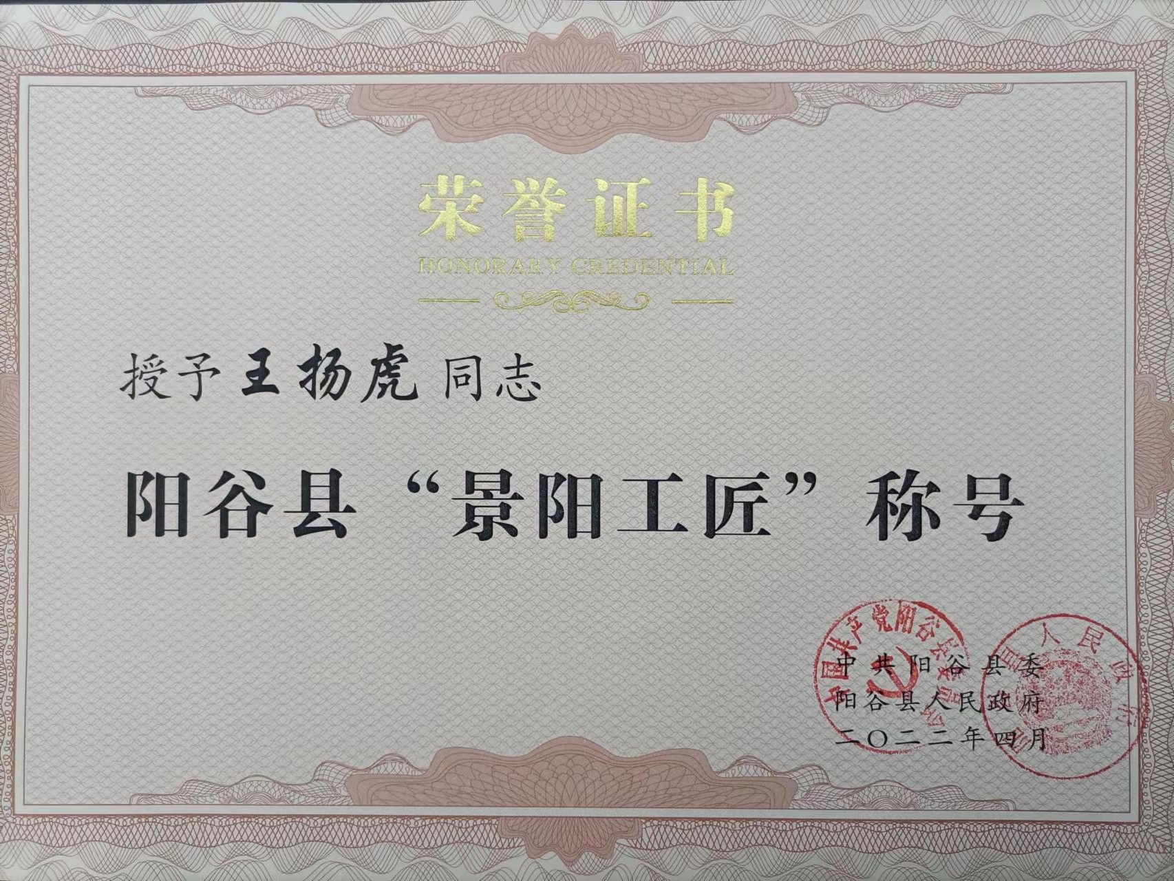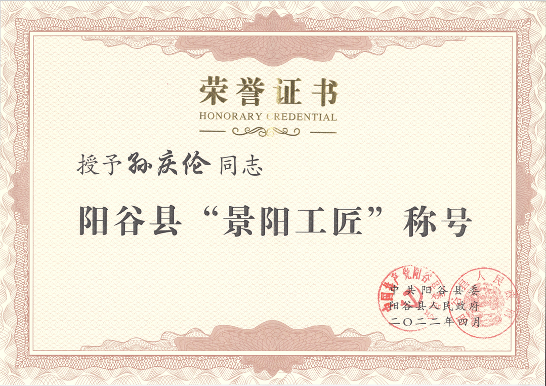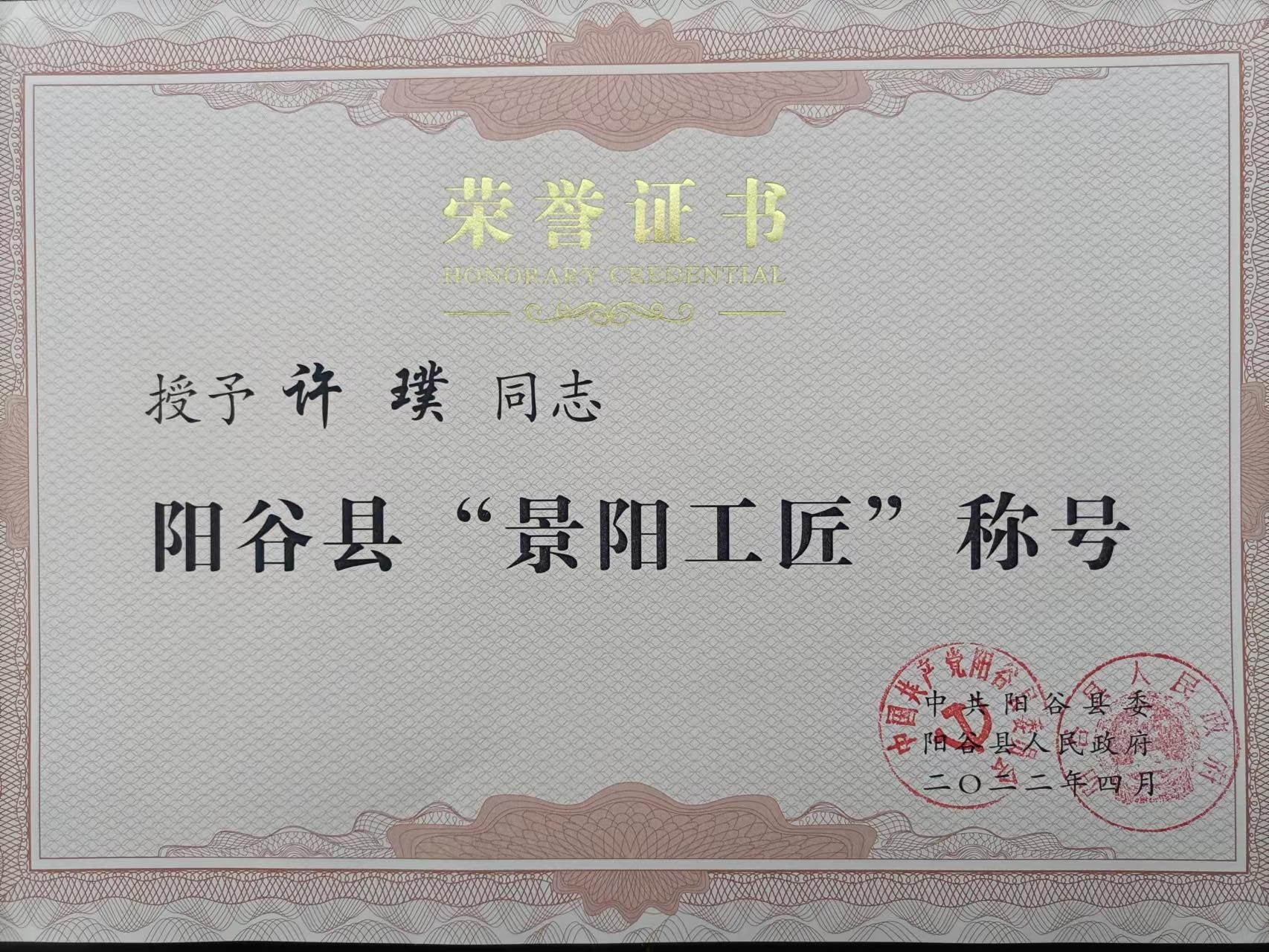 熱烈祝賀我公司叁名員工許璞、孫慶倫、王揚虎被授予陽谷縣“景陽工匠”稱號。