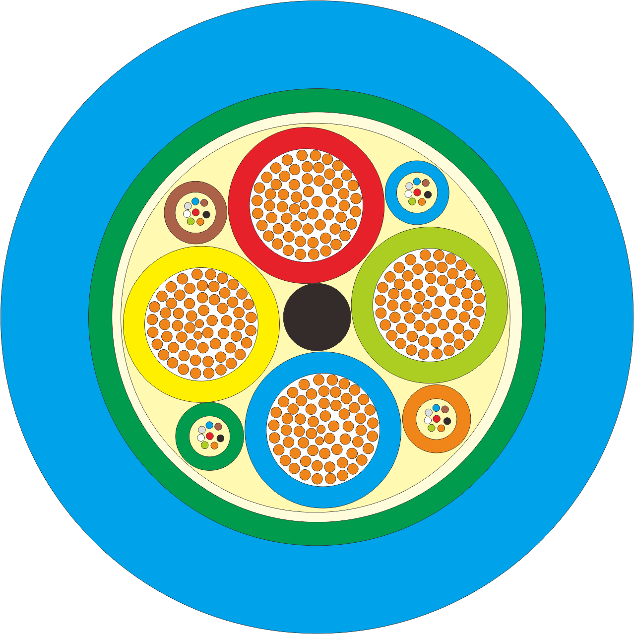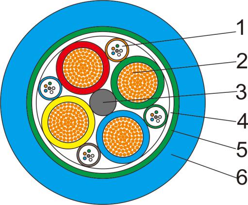 礦用光電混合纜的結構是將 250μm 光纖套入高模量材料制成的松套管中,松套管內填充防水化合物。纜芯中心為金屬加強件(金屬加強件加一層PE墊層)。電線與松套管(和填充繩)圍繞中心加強芯絞合成緊湊和圓形的纜芯,纜芯內的縫隙充以阻水材料。雙面涂塑鋼帶縱包后擠制聚氯乙烯(PVC)護套成纜。