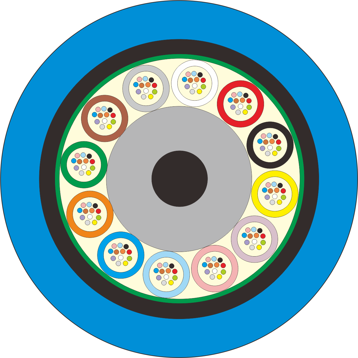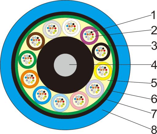 光纜的結構是將250μm光纖套入高模量材料制成的松套管中,松套管內填充防水化合物。纜芯的中心是一根金屬加強芯,對于某些芯數的光纜來說,金屬加強芯外還需擠上一層聚乙烯(PE)。松套管(和填充繩)圍繞中心加強芯絞合成緊湊和圓形的纜芯,纜芯內的縫隙充以阻水填充物,雙面涂塑鋼帶(PSP)縱包后擠制阻燃護套成纜。